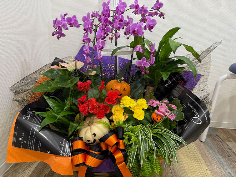 ハロウィン仕様のお花をいただきました。そのほか院内のハロウィンの飾りつけもスタッフが考えて飾りつけをしています。